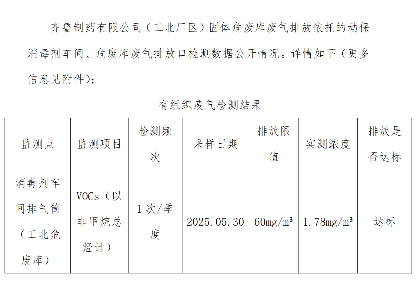 固体危废库废气排放口2025年第二季度环境监测信息公开